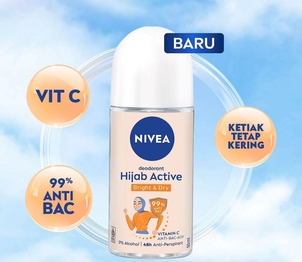 Varian terbaru Nivea Hijab Active Dry & Active Deodorant Roll On dengan kandungan vitamin C bisa membuat daerah ketiak menjadi cerah ditambah anti bakteri jadi mencegah bau badan dan tahan hingga 48 H karena ada anti perpirant jadi tak perlu khawatir ketiak basah,